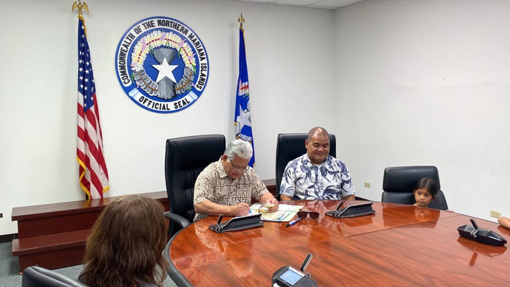 Gov. Arnold Palacios, left, signs H.B. 23-47 into law as its author, Rep. Malcom Omar, looks on.