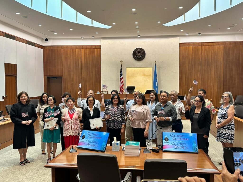 District Court for NMI Chief Judge Ramona V. Manglona, left, and U.S. Citizenship and Immigrations Services Officer Patricia Phelan, right, pose for a March 2025 photo with newly sworn in U.S. citizens Mary Rose Tutor Capati, Freddie Zamora Cataluna, Lea Magno Cataluna, Elena Creencia, Ruben Creencia, Gina Dela Cruz, Nestor Guzman, Sandra Guzman, Jennelyn Roque Itibus, Nam Soo Kim, Editha Lomerio, Paulino Nimer, Eliza Serrano, Recto Velena and Mary Ann Zulueta Wilson.