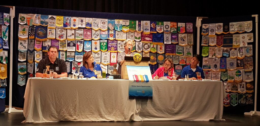 Labor Secretary Vicky Benavente speaks before the Rotary Club of Saipan at Hyatt Regency Saipan on Tuesday. Also in the photo are club president-elect Sean Ficke, club president Sonya Dancoe, club secretary Irene Holl, and club vice president Wendell Posadas. Photo by Junhan B. Todino