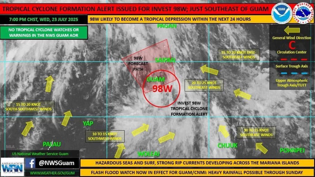 The Joint Typhoon Warning Center has issued a tropical cyclone formation alert for Invest 98w, centered near 12.9n, 145.0e. 98w is expected to develop into a significant tropical cyclone (tropical depression) within 24 hours.