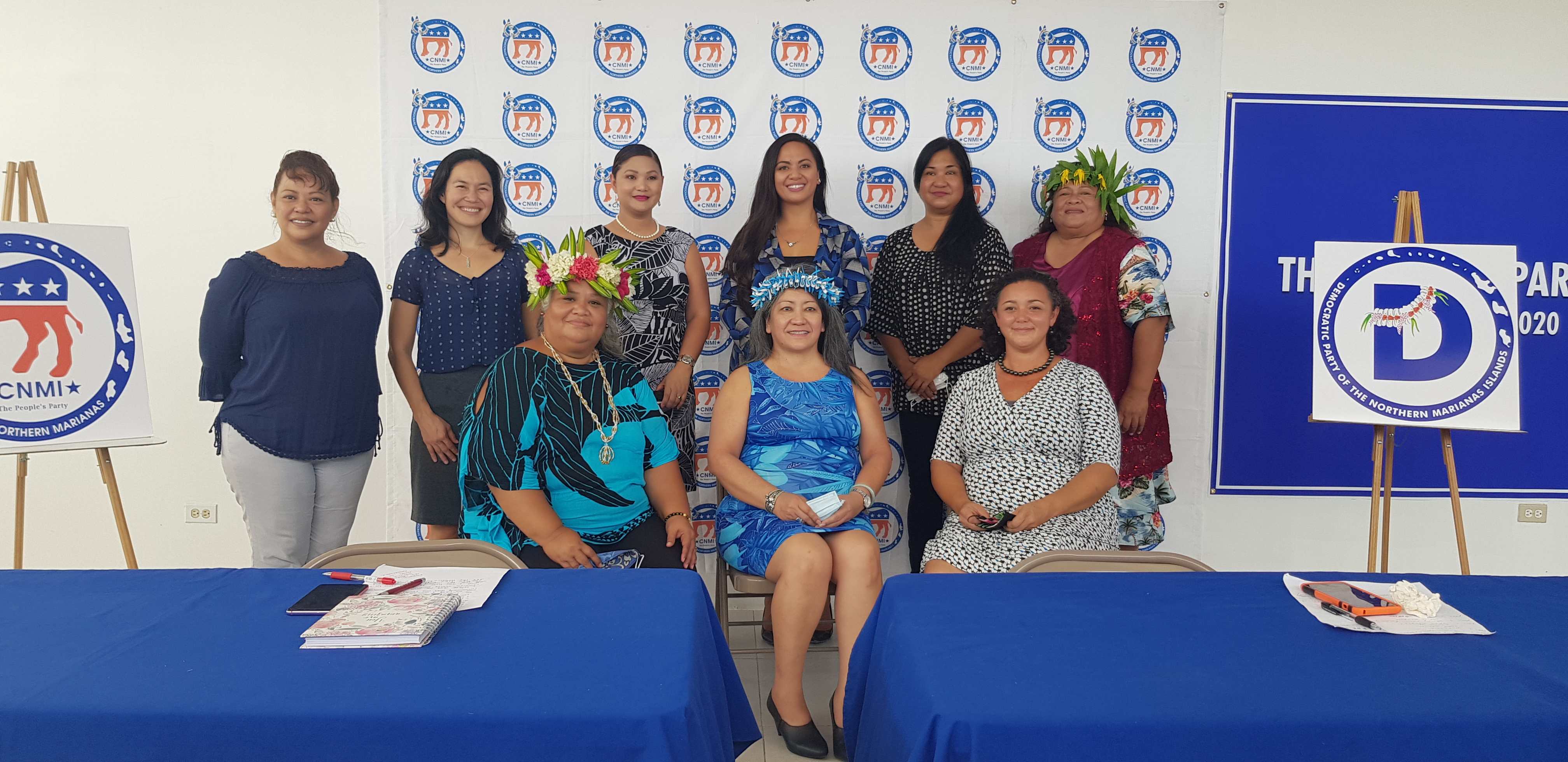 The female candidates of the NMI Democratic Party pose for a photo after a press conference at their party headquarters in Garapan on Saturday. From left, standing, are Precinct 1 House candidate Celina Babauta, Precinct 2 Rep. Tina Sablan, Precinct 3 candidate Corina Magofna, Precinct 4 candidates Rep. Sheila Babauta and Jenita Castro, and Precinct 3 candidate Denita Yangetmai. Seated, from left, are Precinct 2 candidate Luella Marciano, Saipan senatorial candidate Edith Deleon Guerrero and Precinct 5 candidate Leila Staffler. Photo by Emmanuel T. Erediano