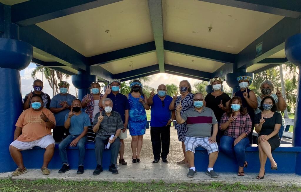 The NMI Democratic Party candidates gesture as they pose for a photo with former Democratic Lt. Gov. Jesus Borja, seated third right, and former Judge Herbert Soll, seated third left, shortly after a meeting at the Kilili Beach pavilion on Wednesday. Contributed photo