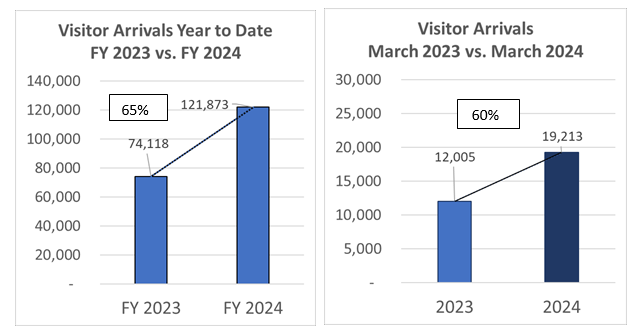 For the second time since the pandemic, visitor arrivals from Japan broke the 1,000 mark, registering 1,470 arrivals in March 2024 compared to 471 visitors in March 2023. Over 680 Japanese arrived on the cruise ship M/S Asuka. As the Japanese yen is weaker against most foreign currencies, domestic travel remains a popular choice. The strong U.S. dollar and weaker Japanese yen and Korean won continue to influence travelers from those countries to choose non- U.S. destinations at this time.
