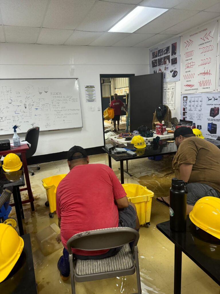 Northern Marianas Technical Institute personnel clean up a classroom flooded by heavy rains on Friday.