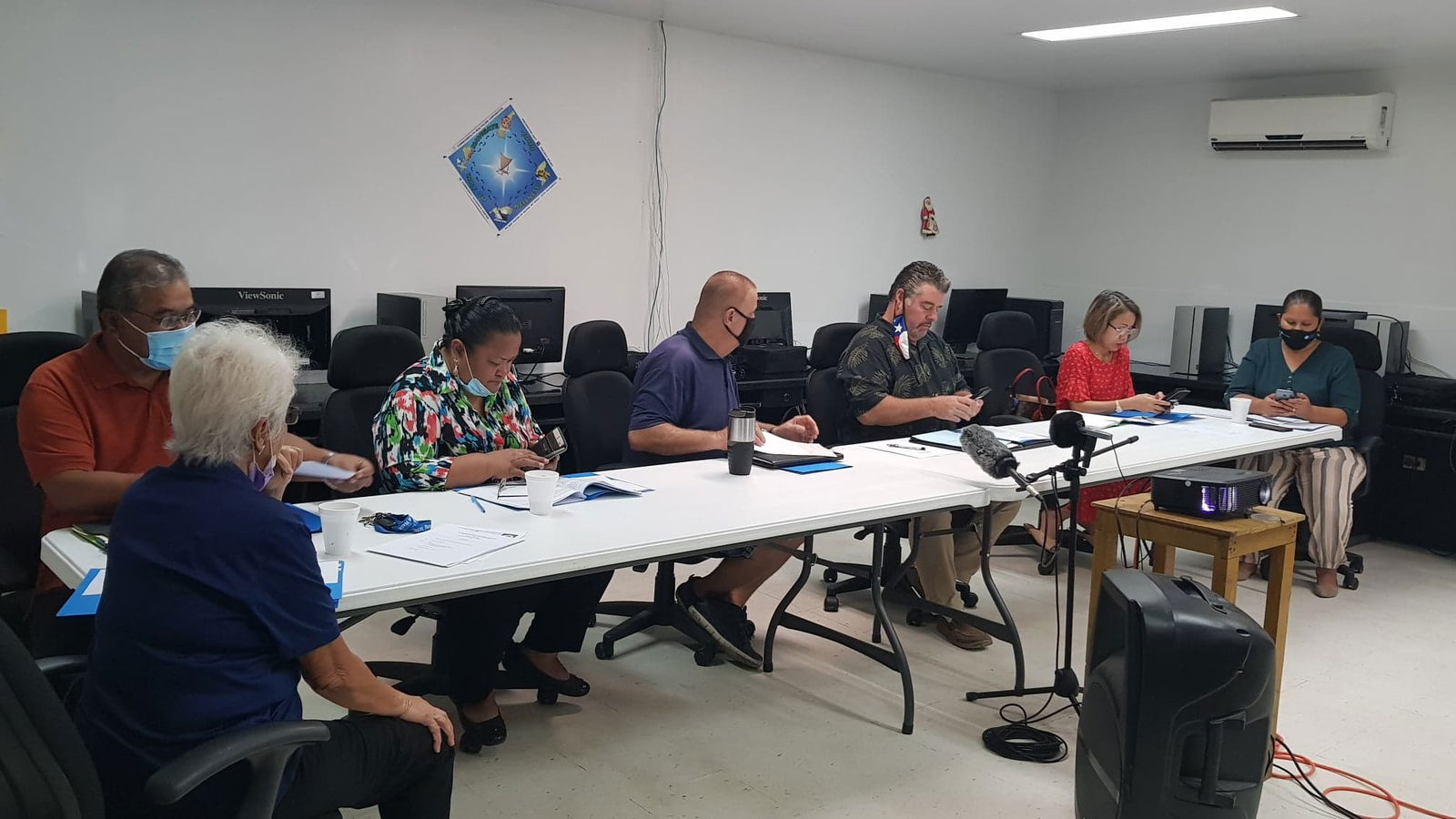 The NMTI board of trustees met on Thursday at the NMTI building in Lower Base. In photo are NMTI chief executive officer Agnes McPhetres, director for administration and finance Frank Rabauliman, trustees Carmelita Faisao, Rick Kautz, board chairman Mario Valentin, and trustees Irene Holl and Catherine Attao. Photo by Lori Lyn C. Lirio