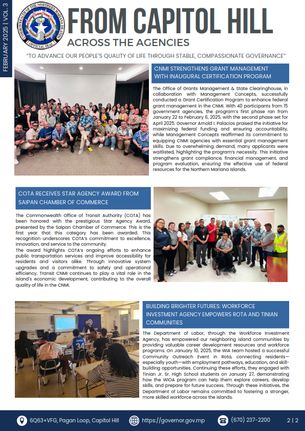 The latest edition of From Capitol Hill: Across the Agencies is now available, featuring key updates from the Commonwealth Medicaid Office, Joeten Kiyu Public Library, Indigenous Affairs, and the Office of Grants Management, COTA, and the Department of Labor. For more information, go to https://governor.gov.mp/news/press-releases/cross-the-agencies-bulletin/from-capitol-hill-across-the-agencies-vol-3