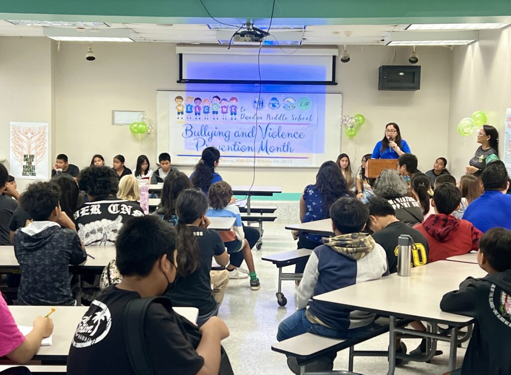 In her remarks during a proclamation-signing ceremony for Bullying and Violence Prevention Month on Wednesday at Dandan Middle School, Interim Commissioner of Education Donna M. Flores reminds students about the importance of being kind and respectful to one another.