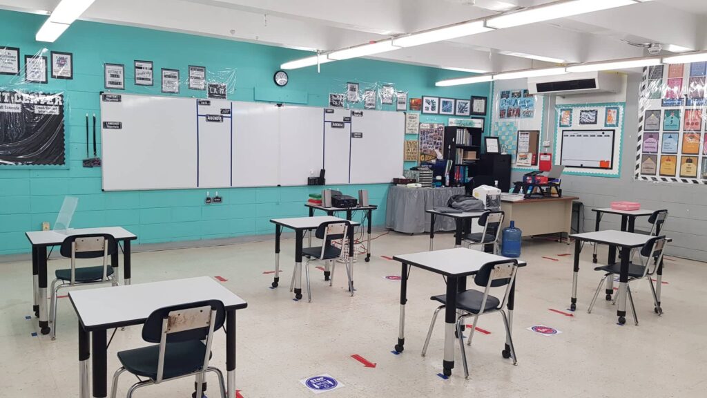 To comply, with the social distancing directives, desks are six feet apart from each other in each of the classrooms of Marianas High School.