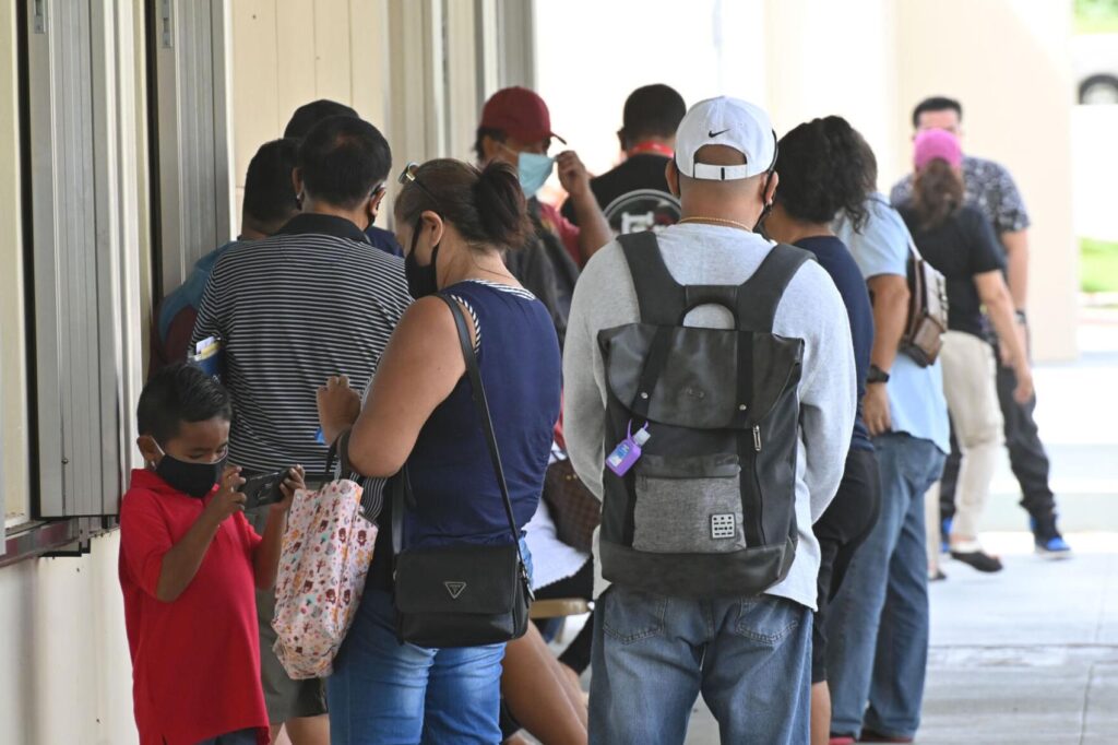 In this July 29, 2020 photo, people line up to enter the Guam Department of Labor Pandemic Unemployment Assistance Center at Guam Community College in Mangilao. Most of Guam’s pandemic-displaced workers have already received their federal unemployment aid payments, but some still haven’t for one reason or another. The Guam Daily Post photo