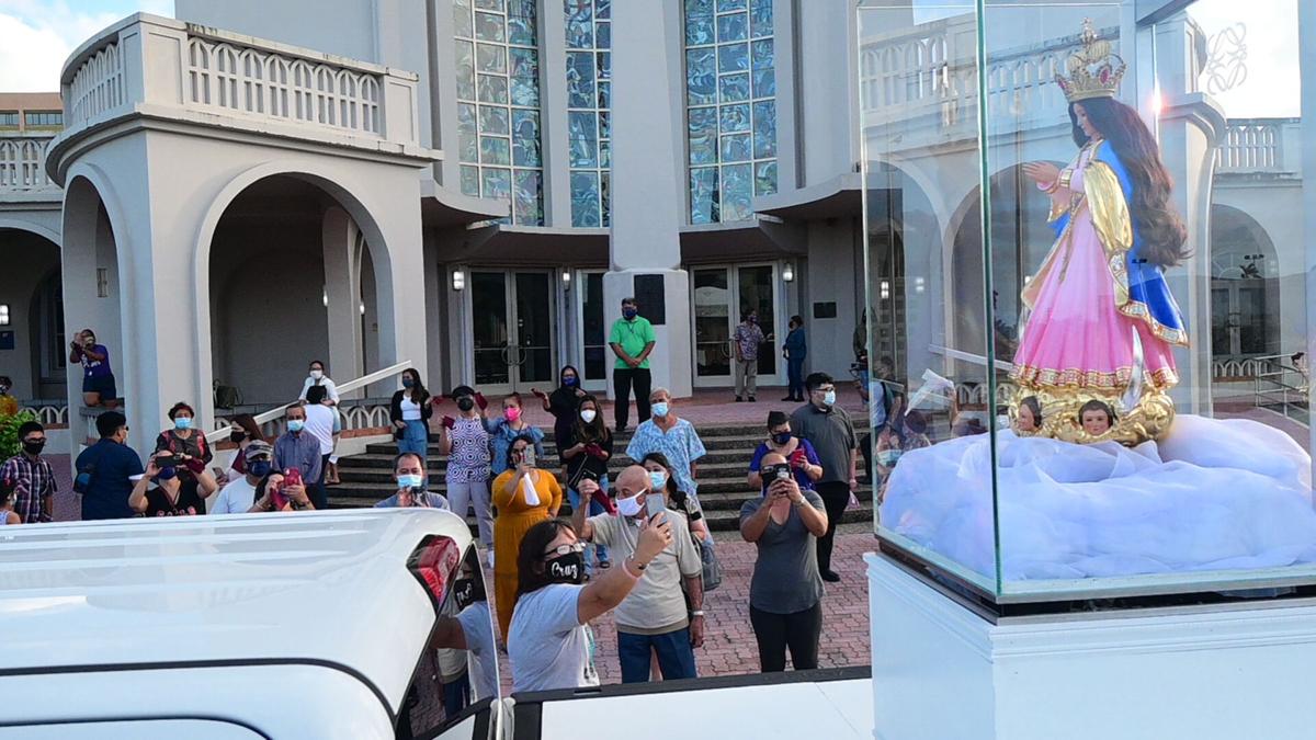 Guam’s Catholic faithful line the road as the statue of Santa Marian Kamalen drives past at the beginning of an islandwide visitation of the parishes starting at the Dulce Nombre de Maria Cathedral-Basilica on Dec. 8, 2020. Photo by David Castro/The Guam Daily Post