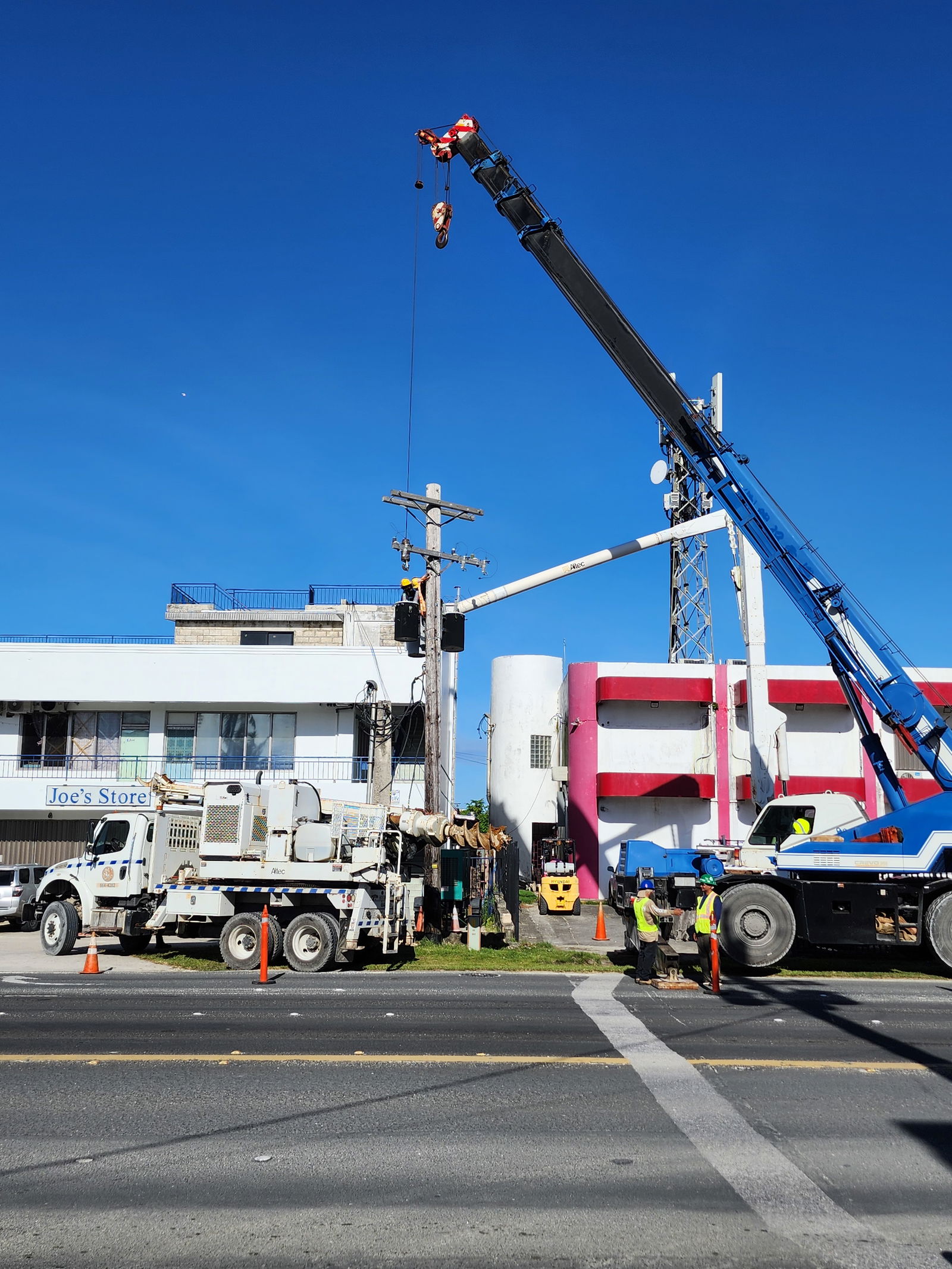 Commonwealth Utilities Corp. crewmembers replace an old wooden power pole on Chalan Pale Arnold or Middle Road, near the Chalan Monsignor Guerrero intersection, Tuesday morning.