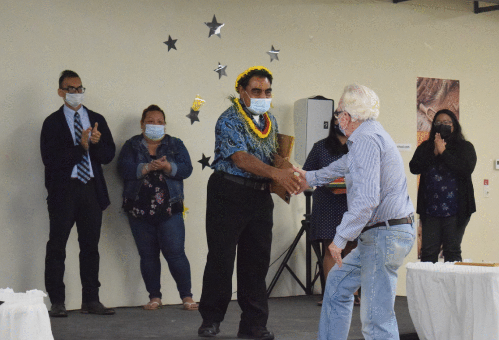 Marianas High School’s Instructor of the Year, Alphonso A. Yangirelit, is congratulated by his former teacher, Public School System federal programs officer Tim Thornburg. Photo by Emmanuel T. Erediano