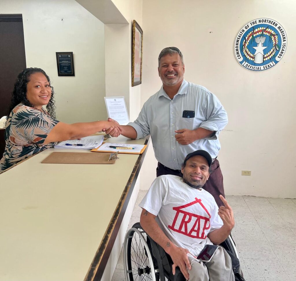U.S. congressional candidate James M. Rayphand, right standing, shakes hands with Commonwealth Election Commission Executive Director Kayla Igitol. Also in photo is his treasurer, John Cabrera. Not in photo: Monissalyn I. Blas, the campaign chair.