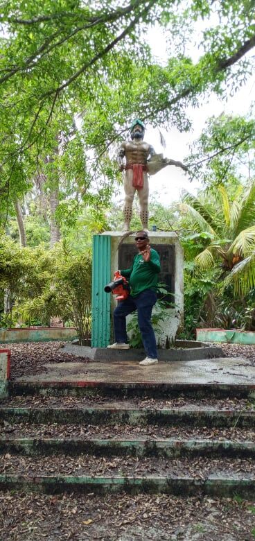 Max Aguon of the Division of Parks and Recreation poses for a photo near the statue of Chief Aghurubw on Managaha during a cleanup activity. Contributed photo