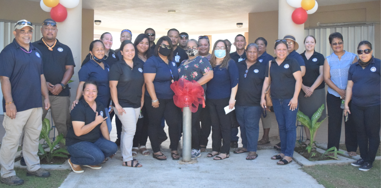 Division of Youth Services Administrator Vivian Sablan, third right, front row, poses with staff members after the ribbon-cutting ceremony for the DYS program outlet at the Kagman Community Center on Wednesday. (Story on page 3)