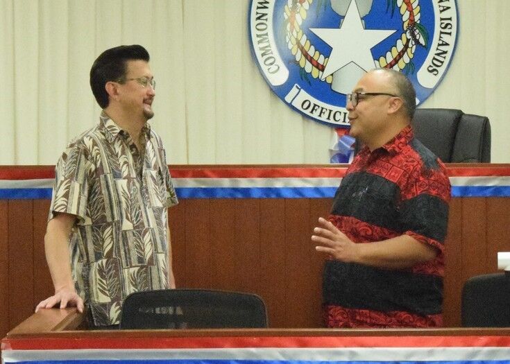 Speaker Blas Jonathan Attao, right, and House Minority Leader Edwin Propst chat during a break from a meeting in the House chamber earlier this year. Photo by Emmanuel T. Erediano