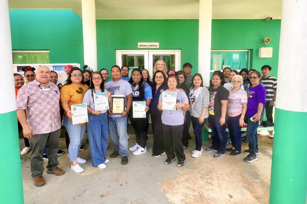 Sinapalo Elementary School’s Administrative Staff of the Year Demmy Catubay, fourth left, front row, was named the CNMI-wide winner of the 2025 Public School System Administrative State Staff of the Year Award. Commissioner of Education Dr. Lawrence F. Camacho, left, made the announcement as part of PSS’ 36th Education Day celebration. Also in photo are the chief executive officer of the Council of Chief State School Officers Dr. Carissa Moffat Miller, standing center, back, PSS Senior Director for Instructional Service Jackie Quitugua, Sinapalo Elementary School Principal Daisy Quitugua as well as the Sinapalo Elementary School Education Day winners: Teacher of the Year, Emmylou Hocog; Instructor of the Year, Alvina King; Trades and Maintenance Staff of the Year, Riza Jingco; and Teacher Aide of the Year-Ally Manglona. Joining them are school staff Mary Grace Mendiola, Lorna Calvo, Leslie Barcinas, Maria Pobeda, Tricia Manglona, Elani Orilla, Kimberly Matagolai, Frince Masga, Roan Barcinas, Lea Maratita, Ricksita Atalig, Shannon Barcinas, Geraldine Dela Cruz, Charlene Cruz, Anna Lee Mendiola, Enterina Calvo, and Melevie Balaan.