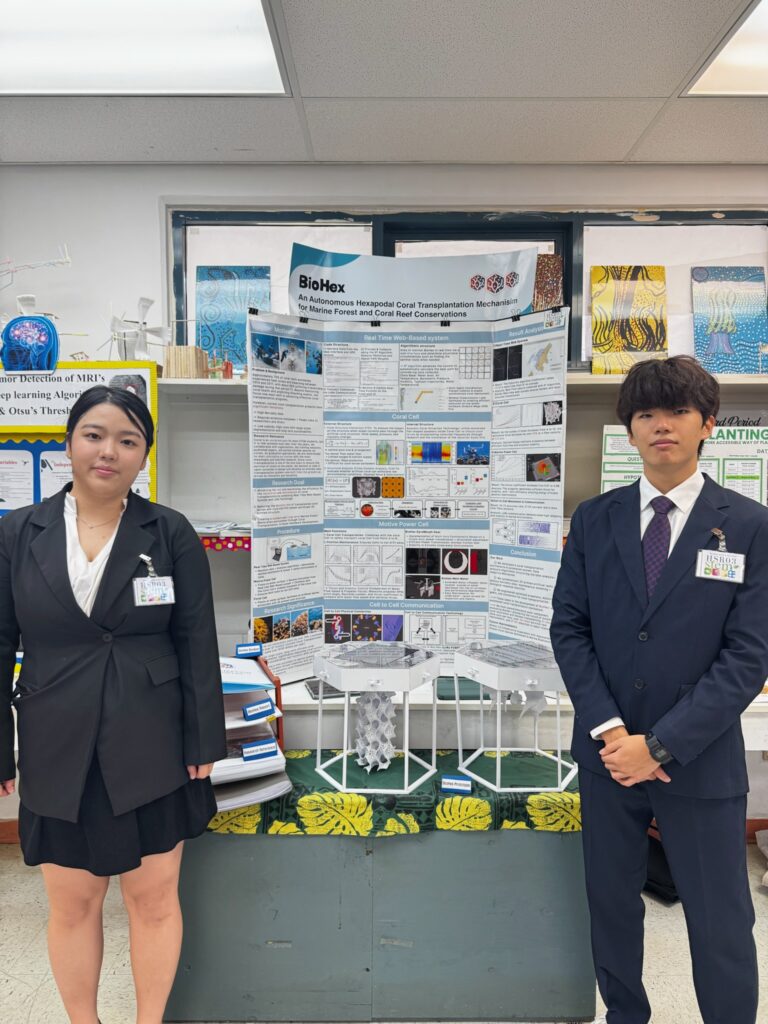 • Ja Young Kim and Ji Ho Kong from Saipan International School for “BioHex: An Autonomous Hexapodal Coral Transplantation Mechanism for Marine Forest and Coral Reef Conservation”