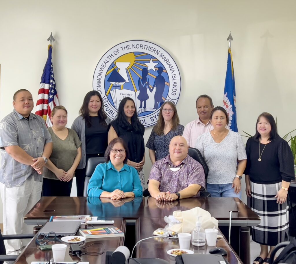 Commissioner of Education Dr. Lawrence F. Camacho, seated, right, with educator Dr. Rita A. Sablan, a former commissioner of education, and members of the U.S. Department of Education’s Comprehensive Centers Network for Region 13 (Pacific 2): Public School System officials Dr. Rizalina Liwag and Dr. Yvonne R. Pangelinan, Federal Programs Officer Jacqueline Che, Career & Technical Education Program Director Dr. Jessica B. Taylor, and Associate Commissioner for Administration Eric Magofna with Mid-continent Research for Education and Learning’s Susan Shebby, Sinton Soalablai, and Erin D’ Amelio.