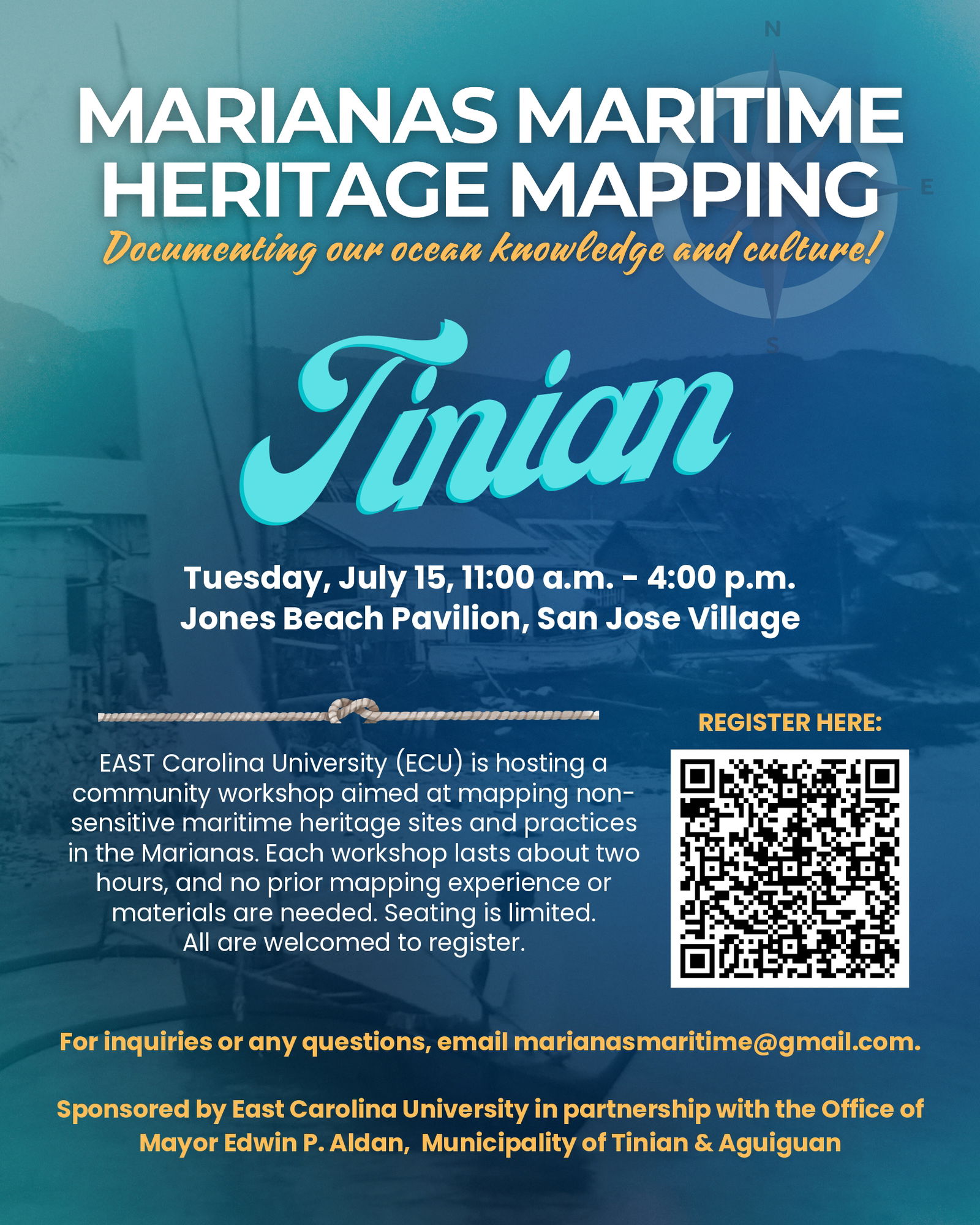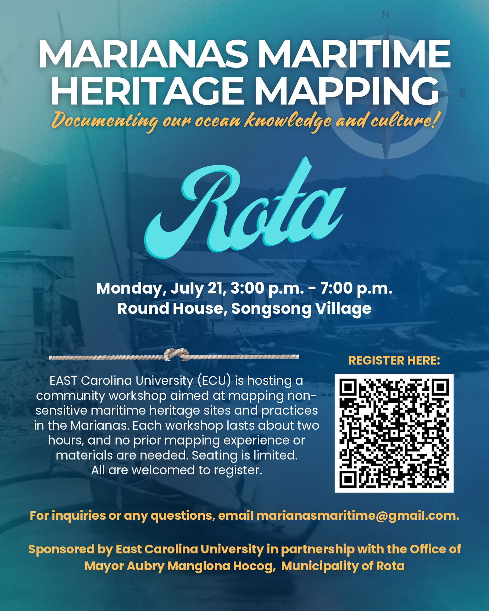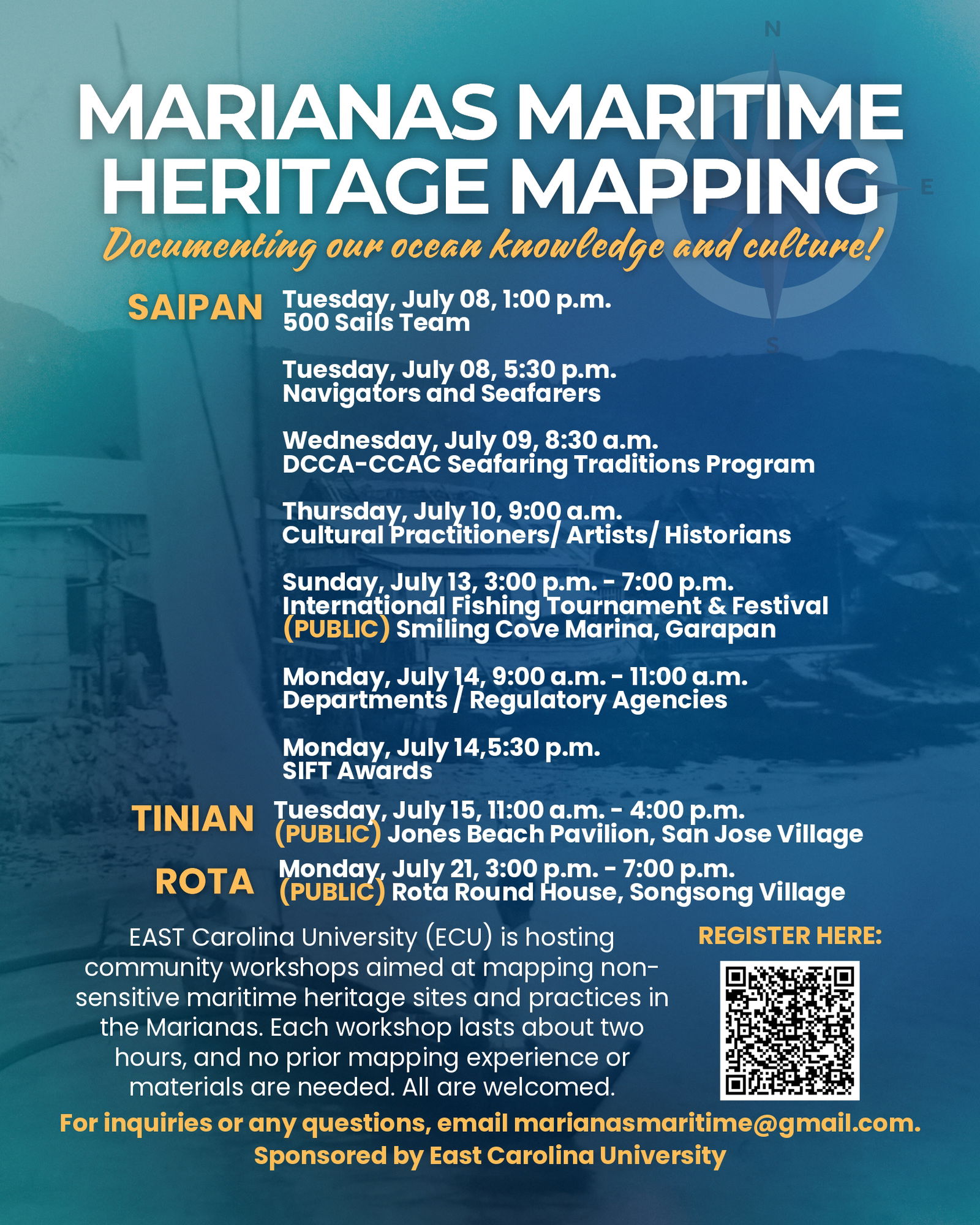REGISTRATION is now open for three public workshops in July in Saipan, Tinian, and Rota aimed at documenting and mapping the maritime heritage sites and practices in the archipelago. Additional mapping sessions are scheduled with specific target groups toward the goal of spreading a wide net to capture community input.