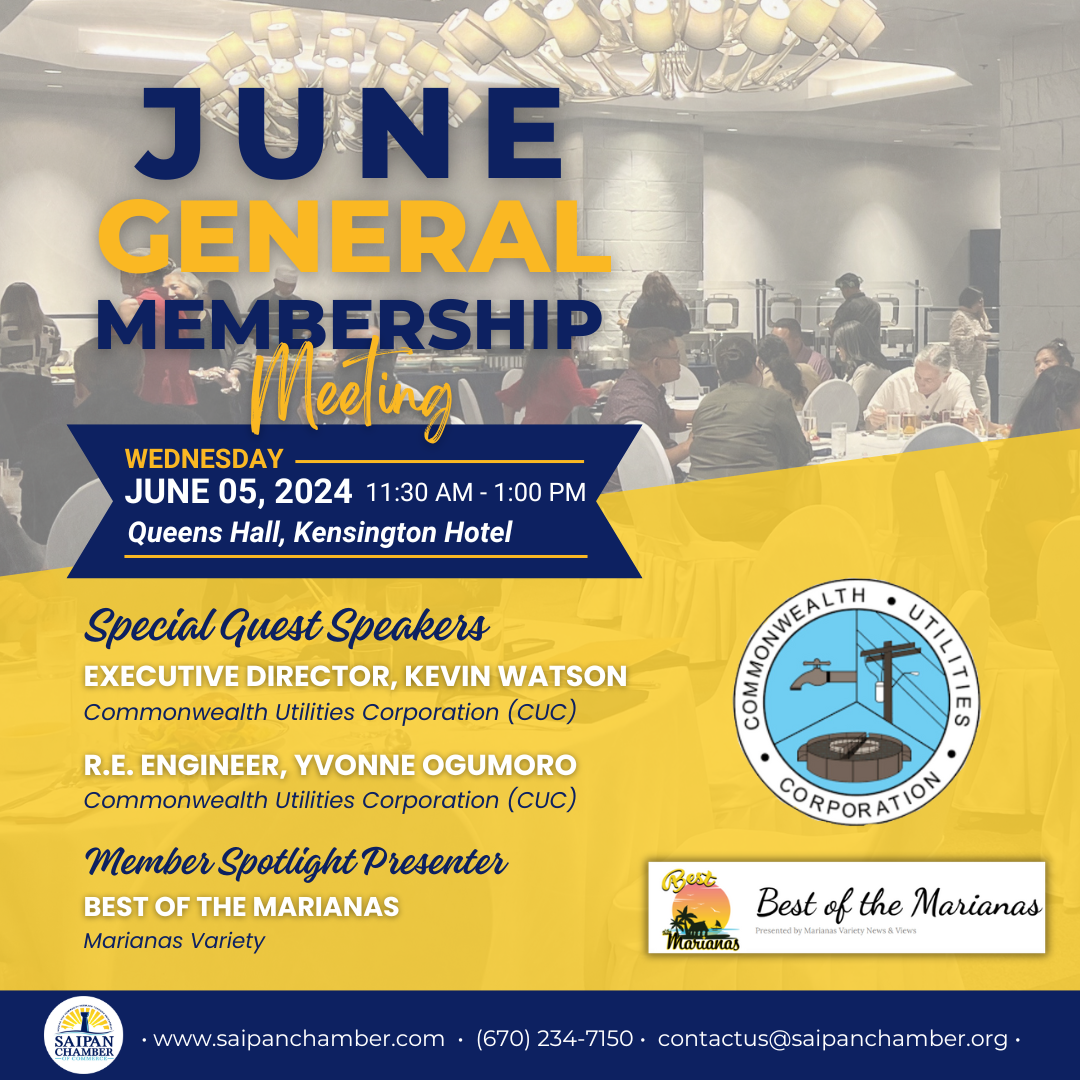 THE Saipan Chamber of Commerce would like to encourage all members and future members to RSVP for its upcoming June general membership meeting scheduled to be held on Wednesday, June 5, 2024 from 11:30 a.m. to 1 p.m. at the Queens Hall, Kensington Hotel Saipan.