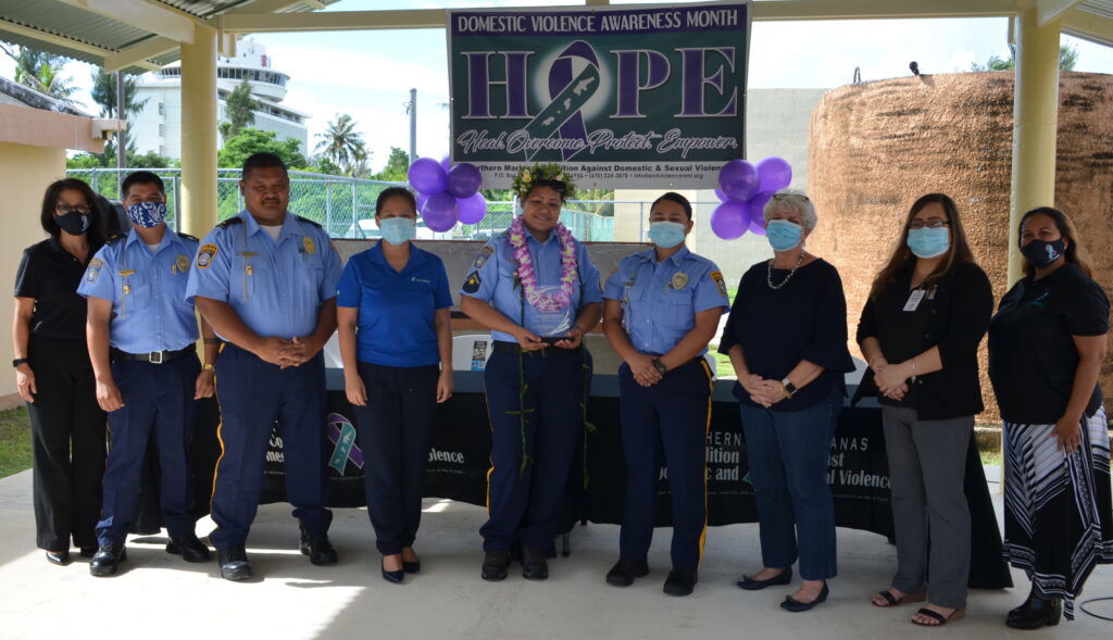 Department of Public Safety Officer Rose Taman Rios, center, fifth from left, accepts the 2020 Bridge of Light Award or BOLA which was recently presented at DPS headquarters. The BOLA is given out each year by the Northern Marianas Coalition Against Domestic & Sexual Violence to honor the accomplishments and efforts of one individual who has worked to end domestic violence and sexual assault in the CNMI. NMCADSV photo