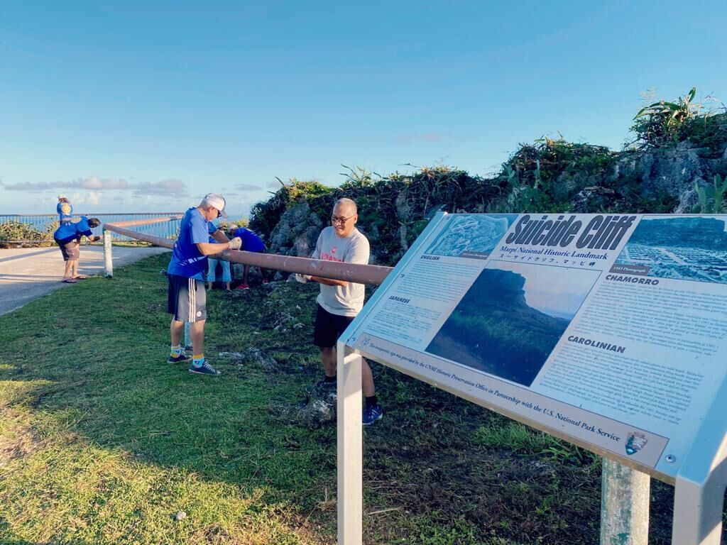 Rotary Club of Saipan members and officials repaint the railings at Suicide Cliff during a recent cleanup drive. Contributed photo
