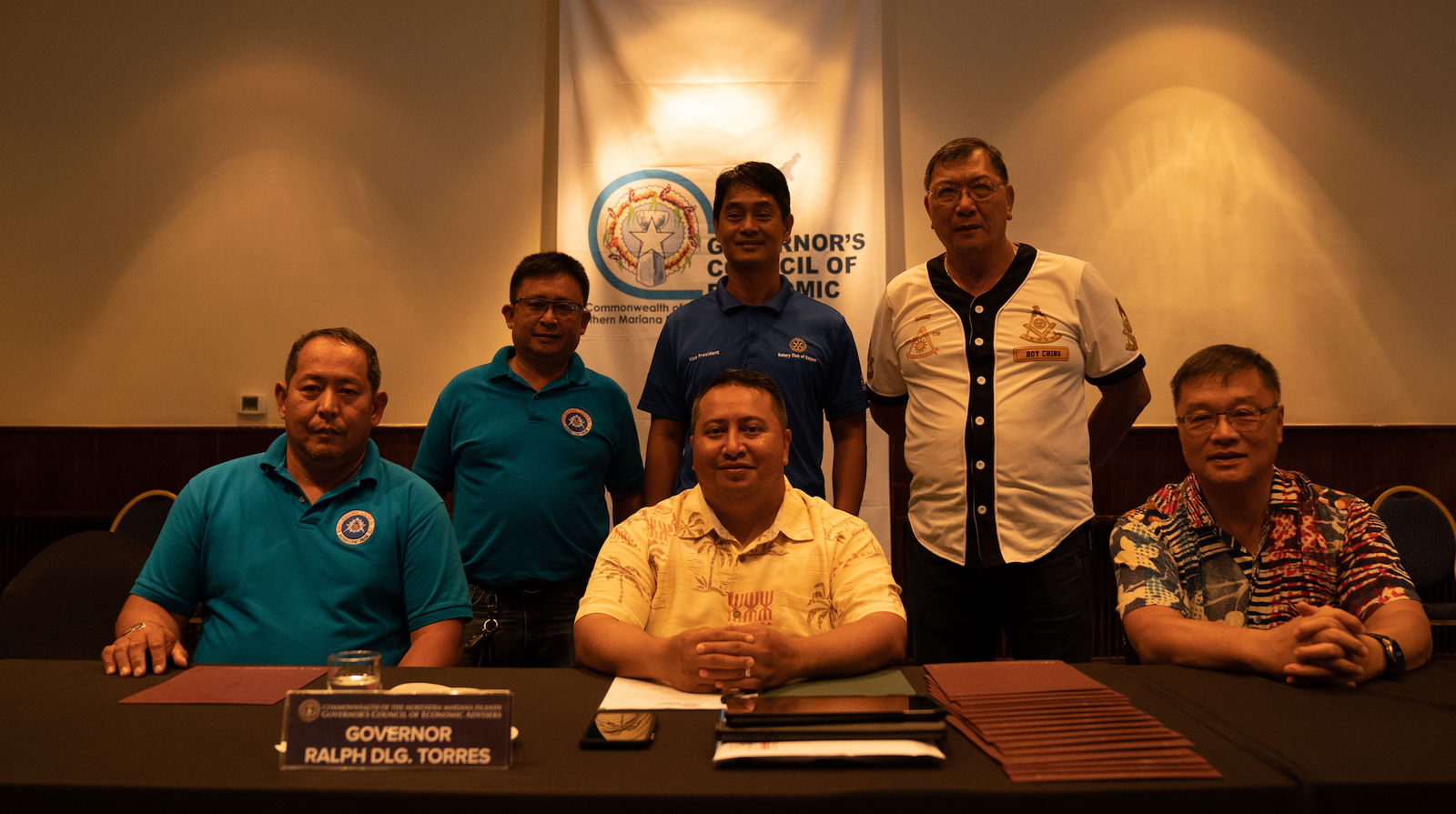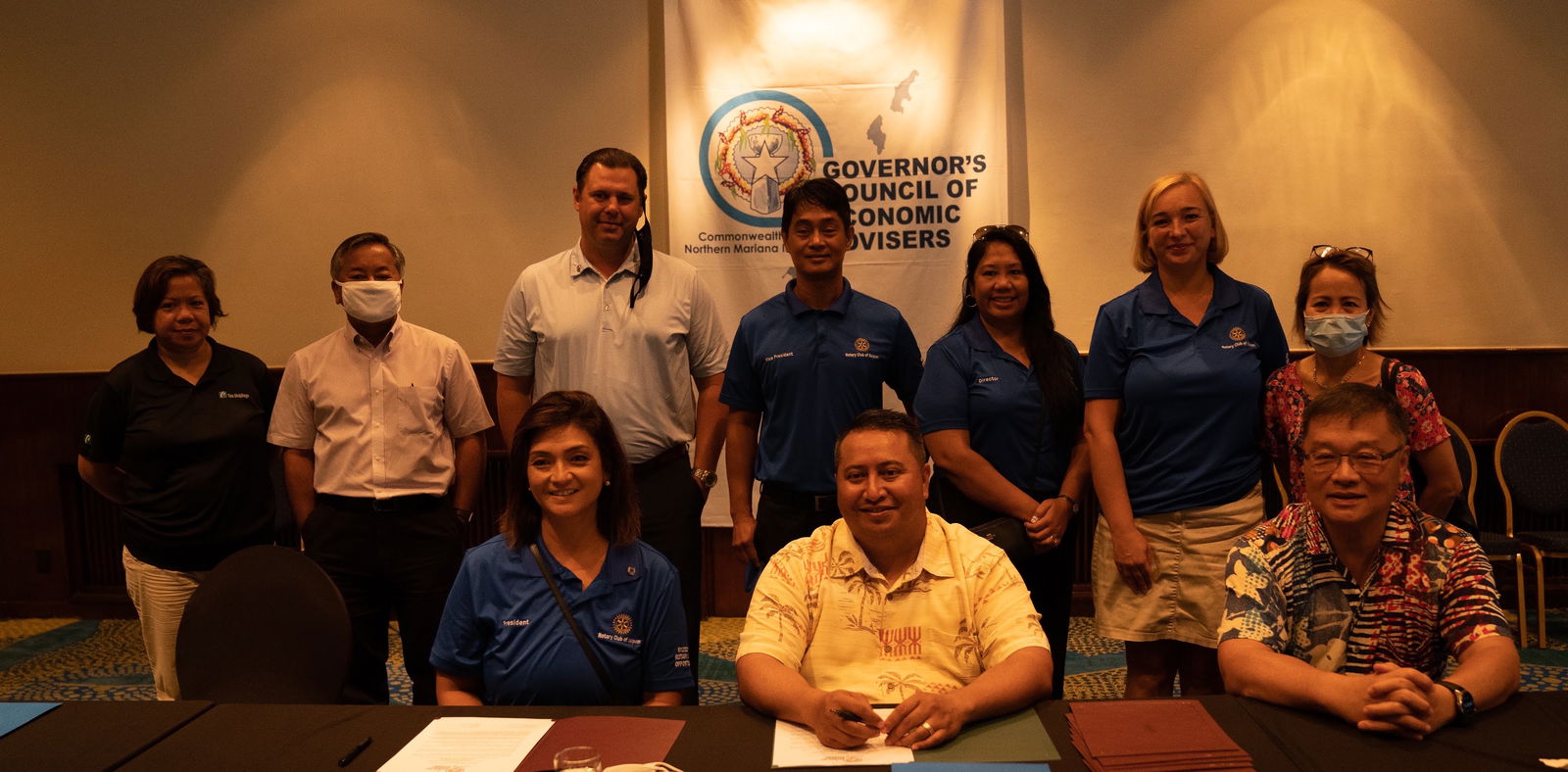 Rotary Club of Saipan members and officials, led by president Sonya Dancoe, seated left, pose with Governor’s Council of Economic Advisers co-chairs Gov. Ralph DLG Torres, seated center, and Jerry Tan after signing up an agreement with the GCEA’s Public Private Partnership program a few of months ago.