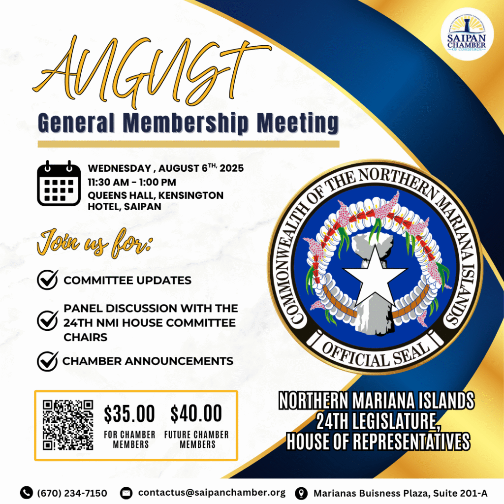 (SCC) — The Saipan Chamber of Commerce proudly announces its August general membership meeting, scheduled for Wednesday, Aug. 6, 2025, from 11:30 a.m. to 1 p.m. at the Queens Hall, Kensington Hotel Saipan.