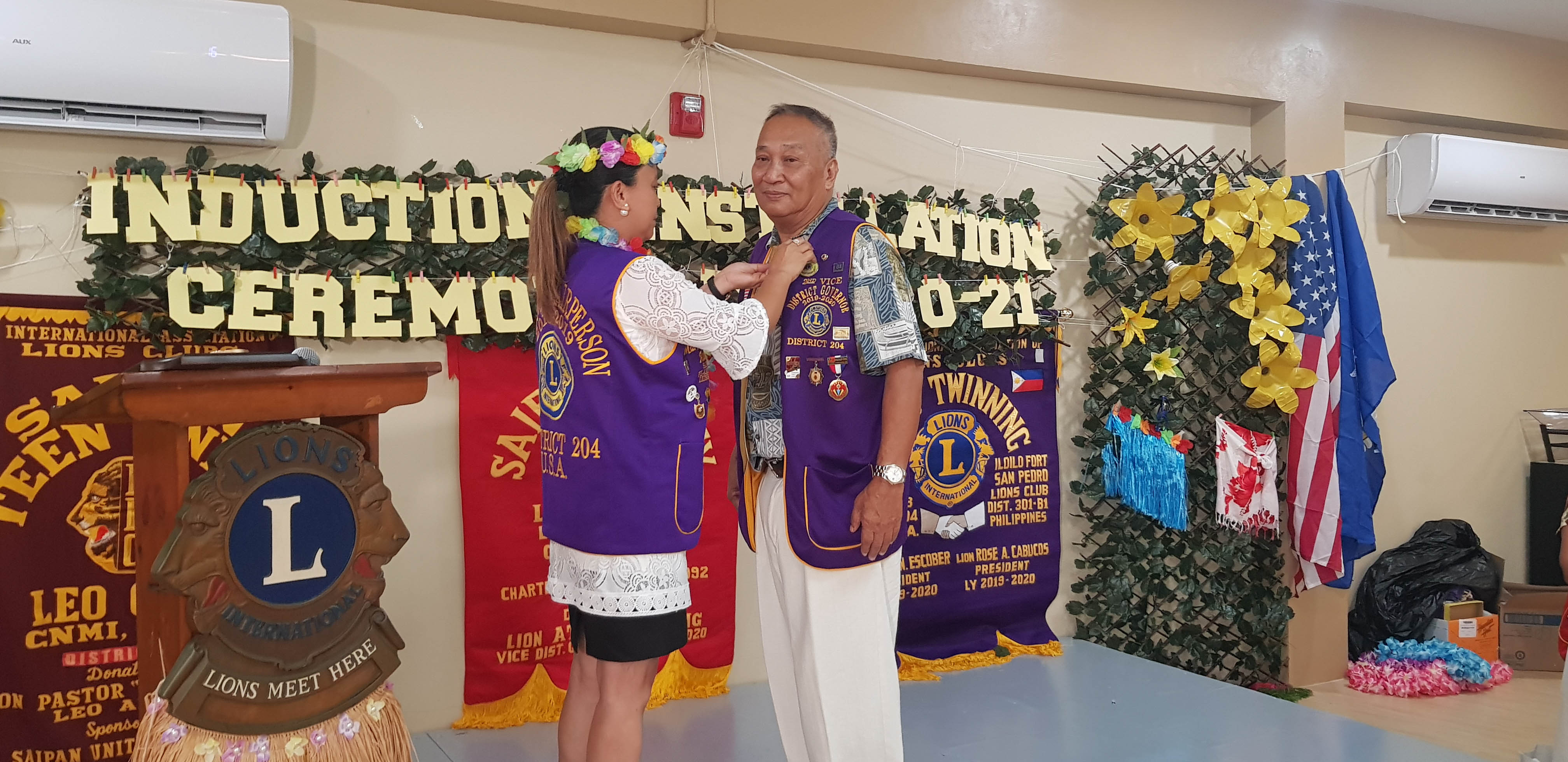 Atoy Banting receives the Melvin Jones Fellow pin from immediate past region chair Annamae Adaza.