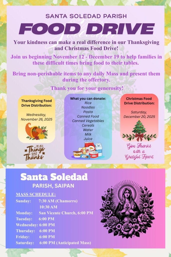(PR) – Santa Soledad Parish in Kagman has launched a community food drive, which began on November 12 and will continue through December 19, to assist families during this difficult time.
