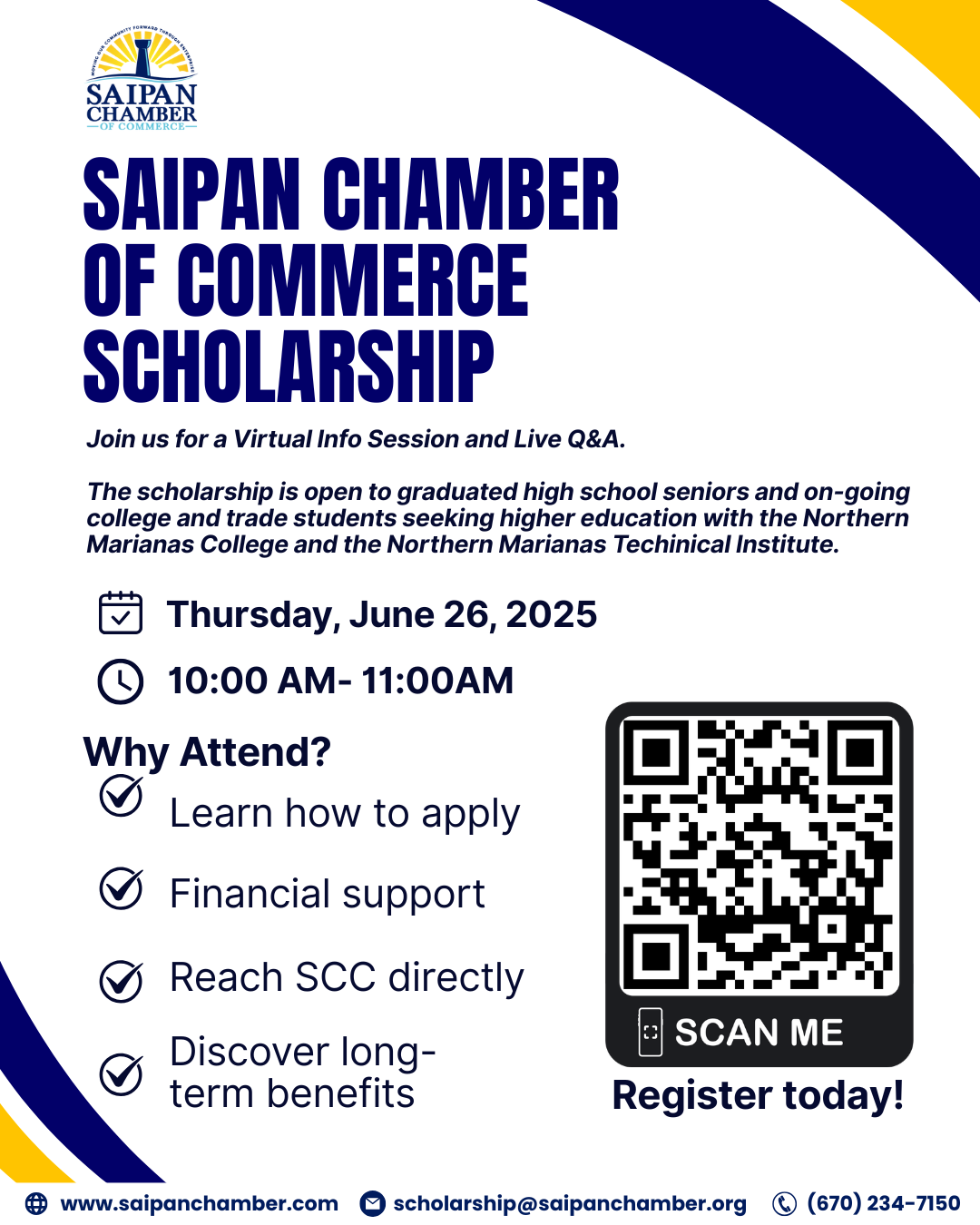 (SCC) — The Saipan Chamber of Commerce has rescheduled its Scholarship Virtual Information Session and Live Q&A to Thursday, June 26, 2025, from 10 a.m. to 11 a.m.