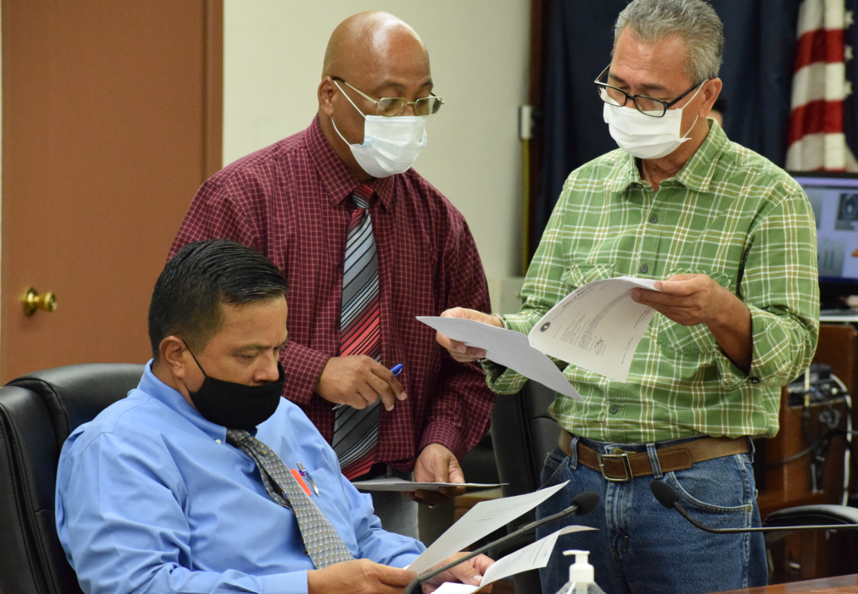 From left, Senate Vice President Jude U. Hofschneider, seated, Sen. Sixto K. Igisomar and Senate Floor Leader Justo Quitugua review the Senate version of House Concurrent Resolution 21-2 during the Senate session on Friday. Photo by Emmanuel T. Erediano