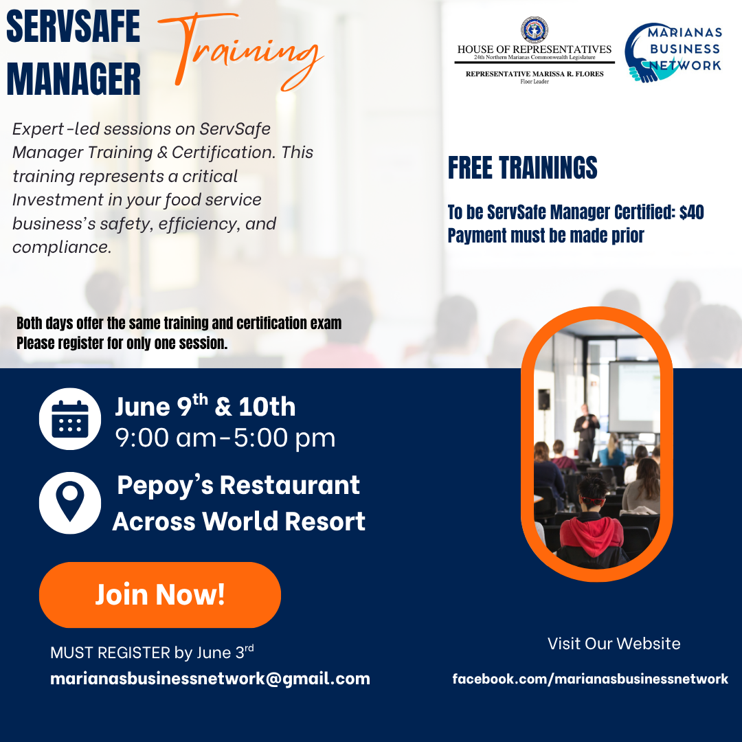 (Special Advertising Feature) — The Marianas Business Network and the Office of Rep. Marissa Flores are pleased to announce a two-day ServSafe certification training for managers of food establishments, to be held on June 9 and 10, 2025, from 9 a.m. to 5 p.m. in Pepoy’s Restaurant banquet room. This important training will conclude with a certification exam proctored onsite on both days by an industry expert.