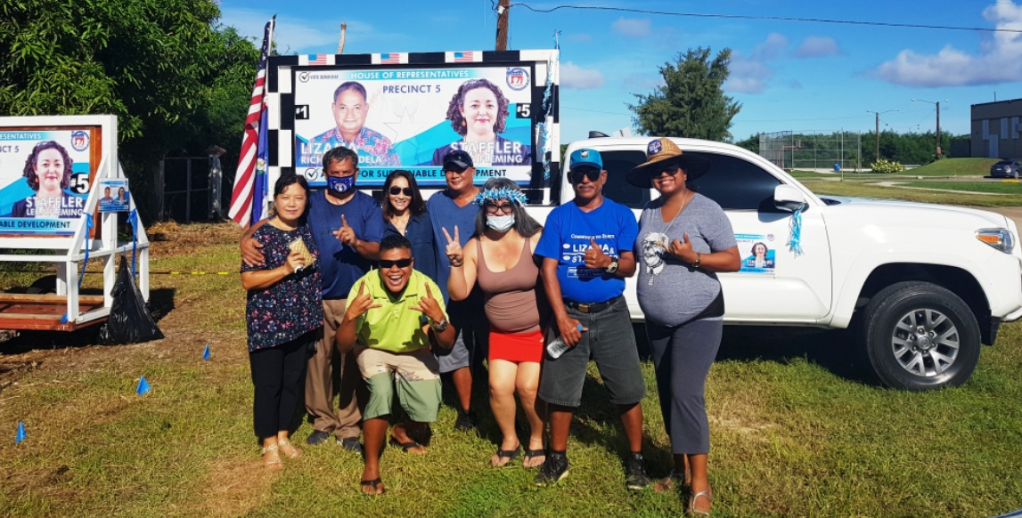 Precinct 1 House candidate and incumbent Rep. Richard Lizama poses with fellow Democrat Edith Deleon Guerrero, who is running for Saipan senator, NMI Democratic Party Chairwoman Nola Hix and other supporters near the Kagman Community Center on Tuesday. Photo by Bryan Manabat