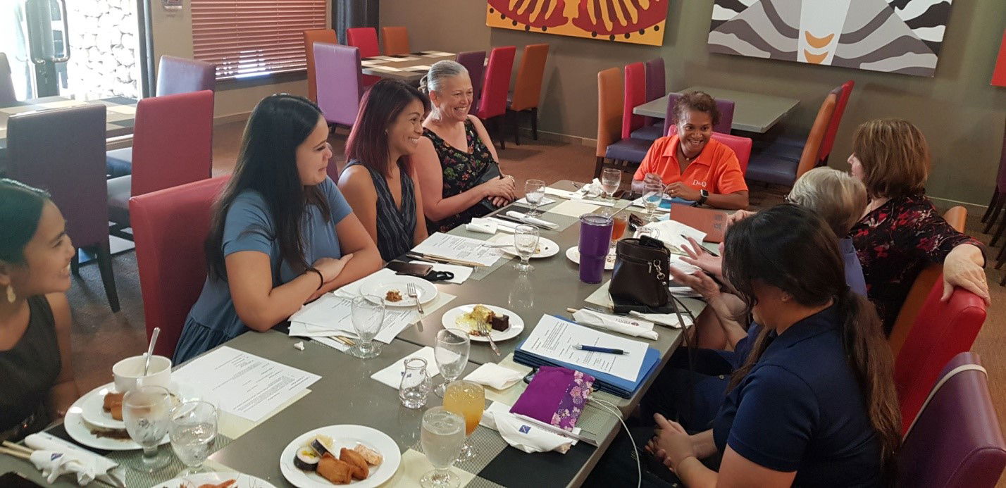Members of the Soroptimist International–Northern Mariana Islands discuss their upcoming activities during their monthly luncheon meeting on Thursday at Fiesta Resort’s World Café. Photo by K-Andrea Evarose S. Limol