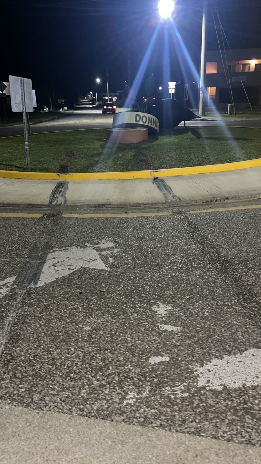 Tinian’s iconic Donni Sali statue was struck down by an unknown vehicle Saturday evening. Tire marks can still be seen near the statue.