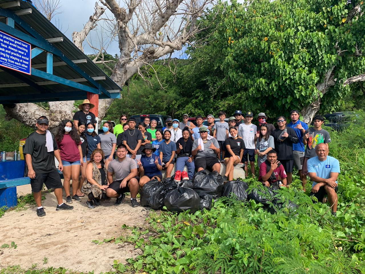Tasi to Table Youth Fishing Club members and volunteers with the Micronesia Islands Nature Alliance pose for a photo during a cleanup activity at Laulau Beach on Nov. 21, 2020. Contributed photo