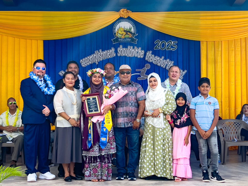 As valedictorian, Tazri received the Board of Education Academic Excellence Award from BOE Chairman Aschumar Kodep Ogumoro-Uludong, Vice Chairman Anthony L. Barcinas, and BOE member Andrew L. Orsini.
