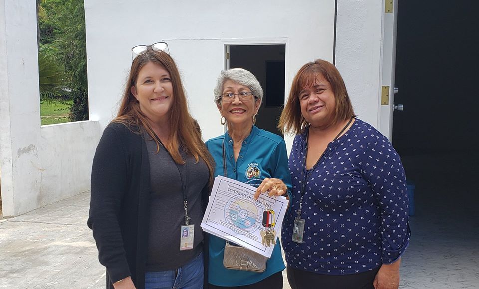 Kimberly Conrad and Mary Muna of the FEMA Permanent Housing Construction Repair Program turn over the keys and occupancy permit to Dolores “Loling” Cruz. Severe damage caused to the Cruz home by Super Typhoon Yutu included the loss of her roof and significant damage to the interior. Contributed photo