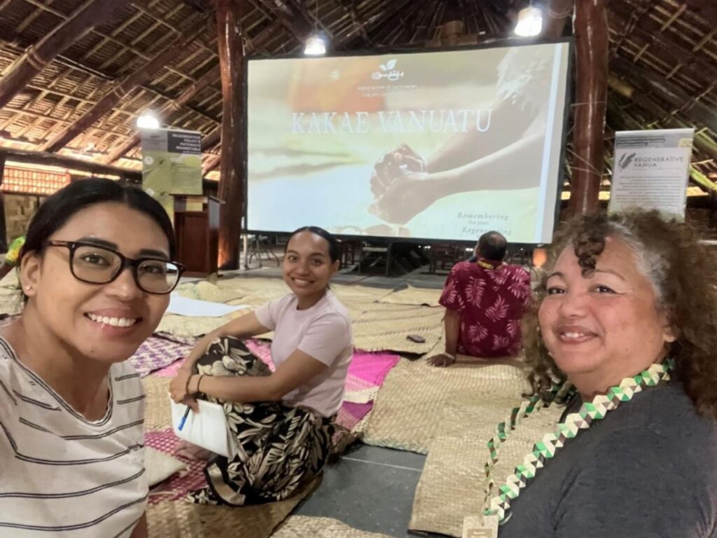 From left, Marianas Visitors Authority Product Development Manager Raquel Aguon, Marianas entrepreneur and regenerative agroforestry practitioner Dana Calvo, and, Northern Mariana Islands legislative staffer and aspiring regenerative tourism practitioner Zania Fleming learn about regenerative policies and practices at the Regenerative Tourism Policy Roundtable hosted by non-profit Regenerative Vanua on July 16-19, 2025, in Port Vila, Vanuatu. The Marianas was represented at the event through the Northern Marianas College Green Growth Initiative.