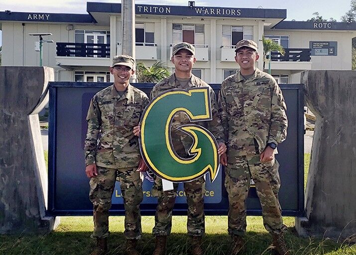 UOG ROTC cadets pose for picture in front of the ROTC Building. From left, Cadets John Bautista, Noel Degracia, and Justin Cayading. UOG photo