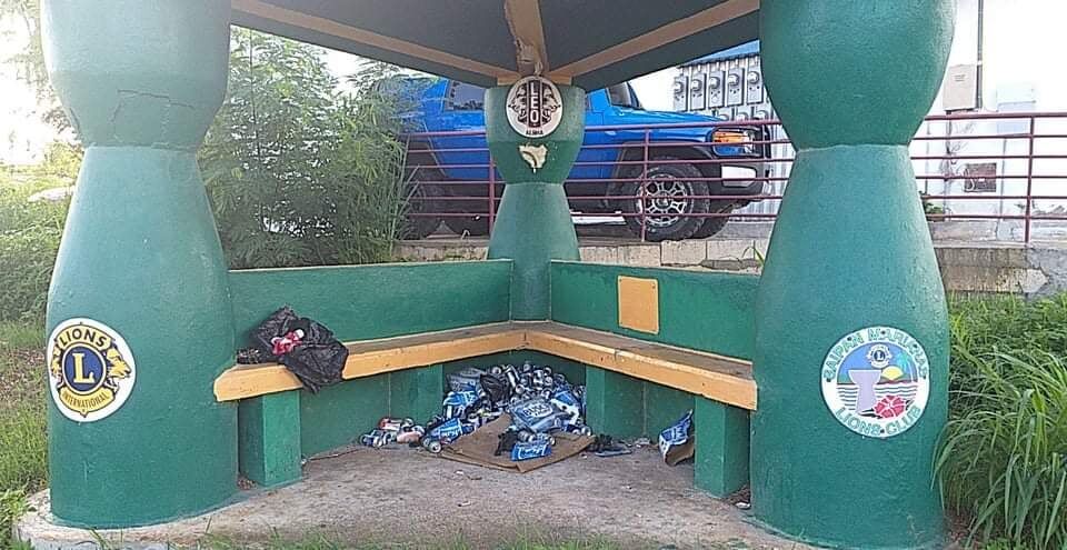 Empty beer cans, bottles, cigarette butts and packs have been dumped at a school bus shelter in Gualo Rai. Contributed photo