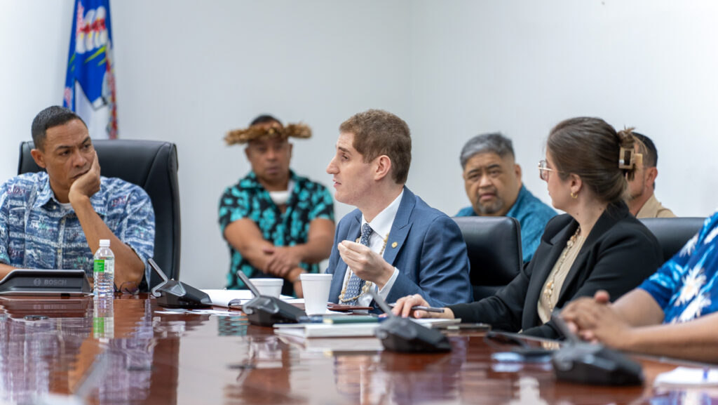 U.S. Department of Transportation Deputy Assistant Secretary for Aviation and International Affairs Jared Smith speaks during a meeting Monday with CNMI officials at the administration building on Capital Hill. Also in photo are Lt. Gov. Dennis James Mendiola, senior policy advisor Clyde Norita, acting Special Assistant for Administration John “Bolis” Gonzales, and USDOT Aviation and International Affairs negotiator Tricia Kurbin.