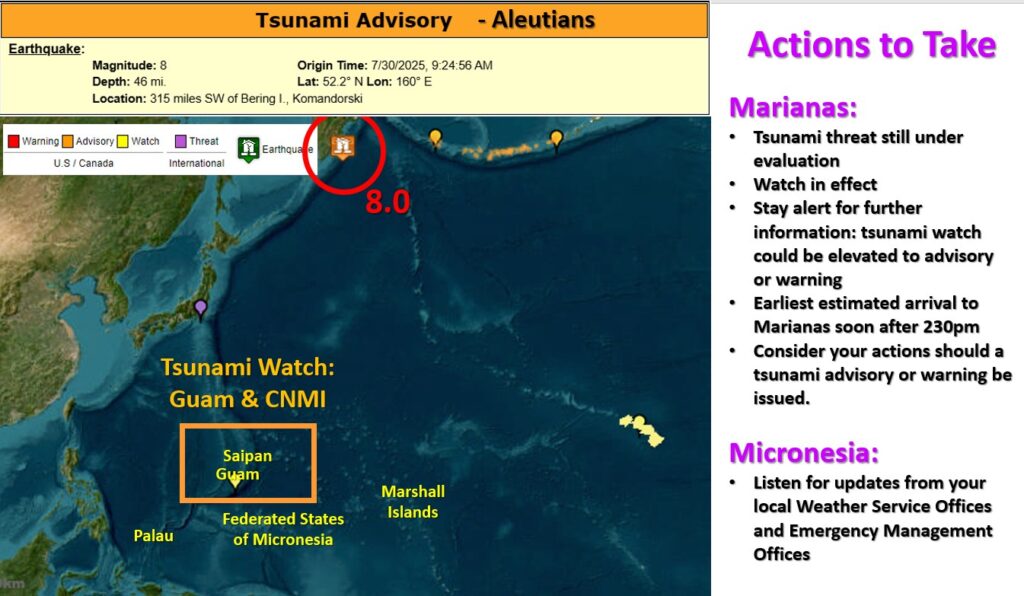 As advised by the Pacific Tsunami Warning Center, a tsunami watch is now in effect for Guam and the CNMI. The tsunami threat to Guam, Rota, Tinian, and Saipan from this earthquake is still being evaluated.