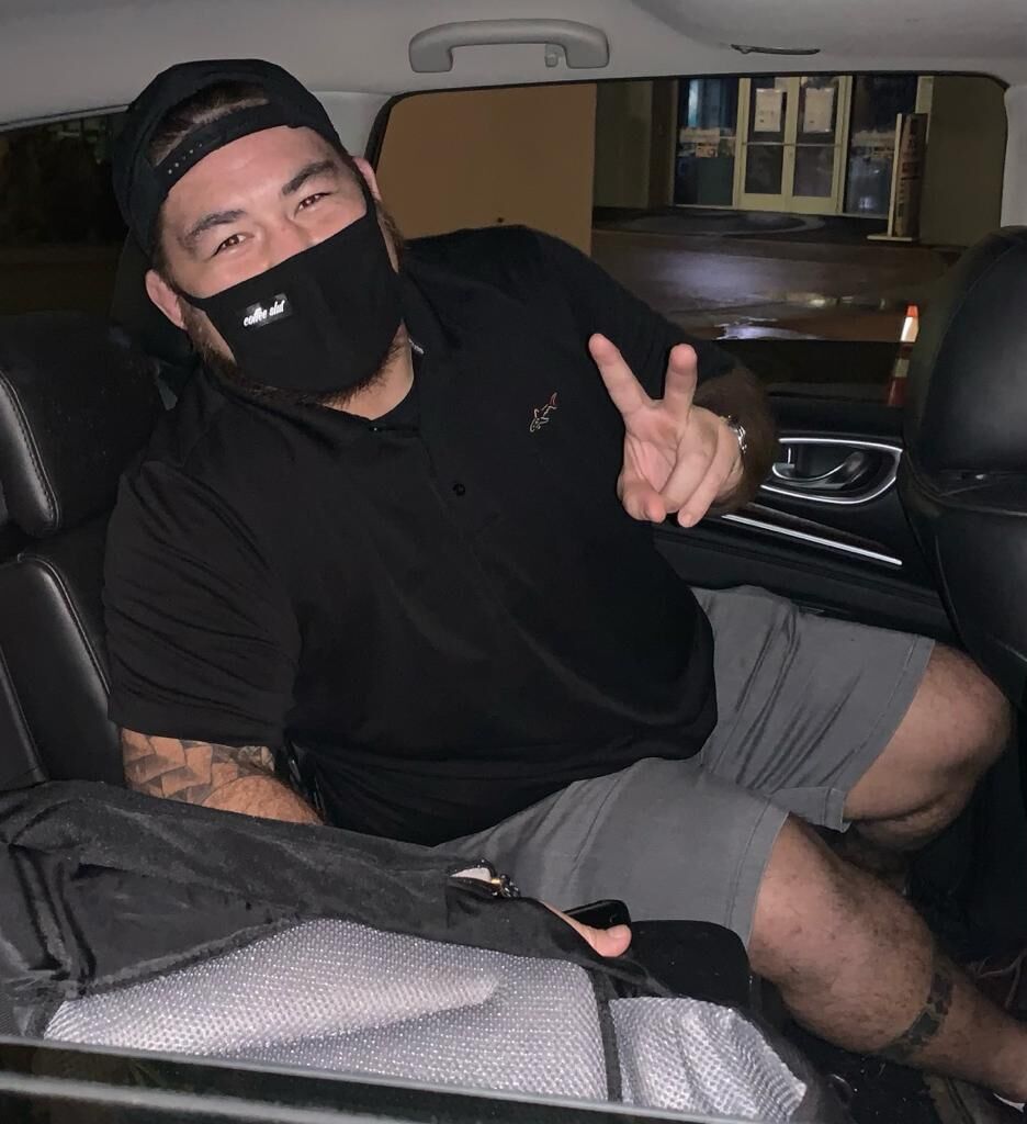 UFC fighter Roque Martinez flashes the peace sign as he leaves a government of Guam quarantine site on Saturday night. Photo by Nick Delgado/ The Guam Daily Post