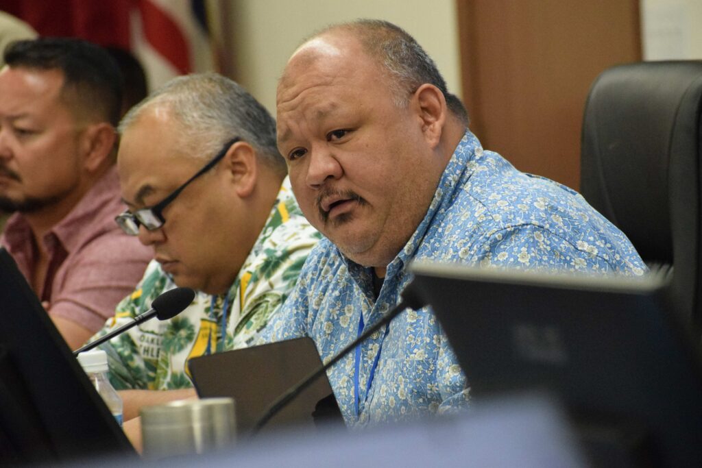 Rep. John Paul Sablan speaks during a bicameral conference committee meeting in the House chamber on Tuesday.