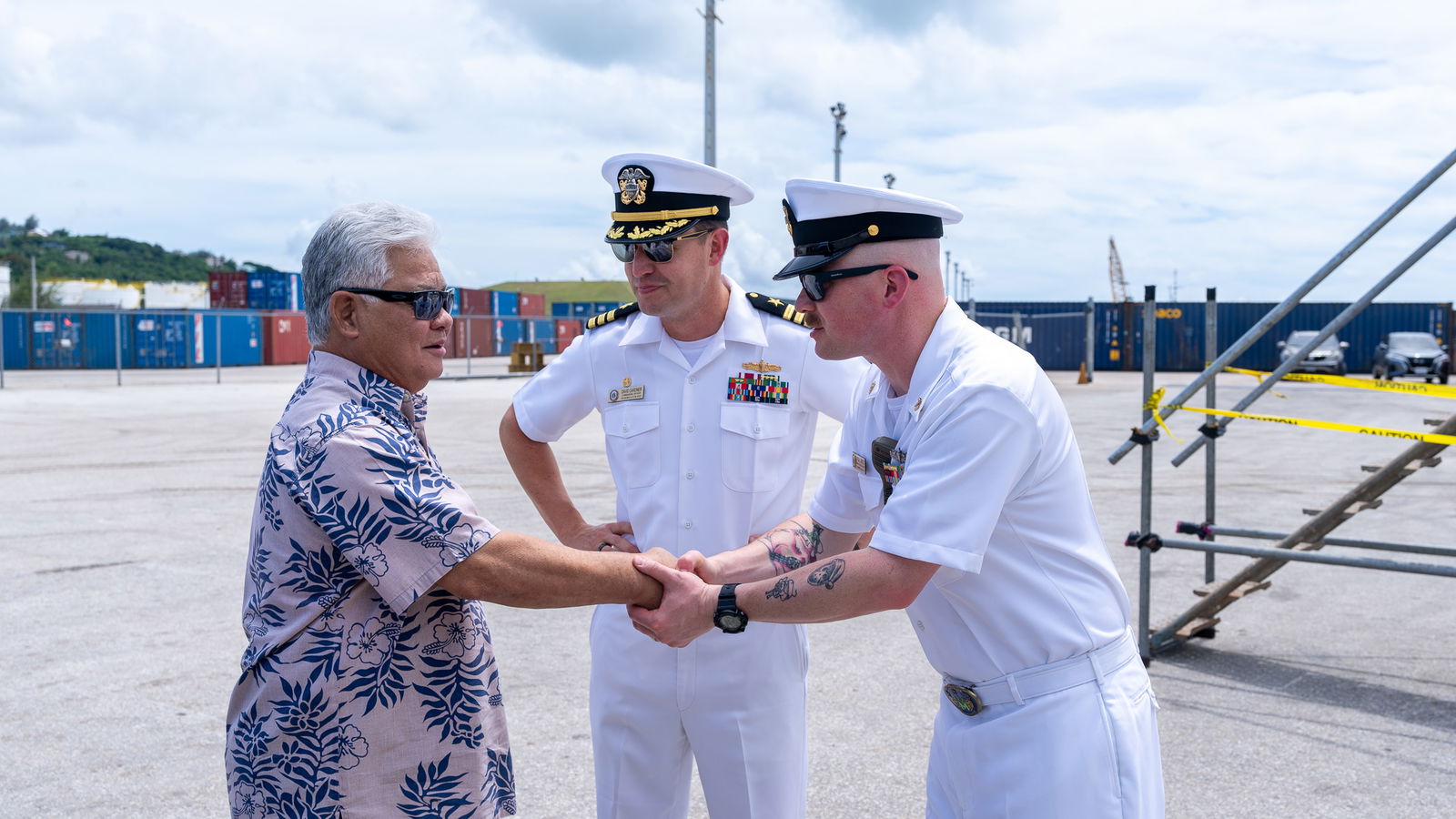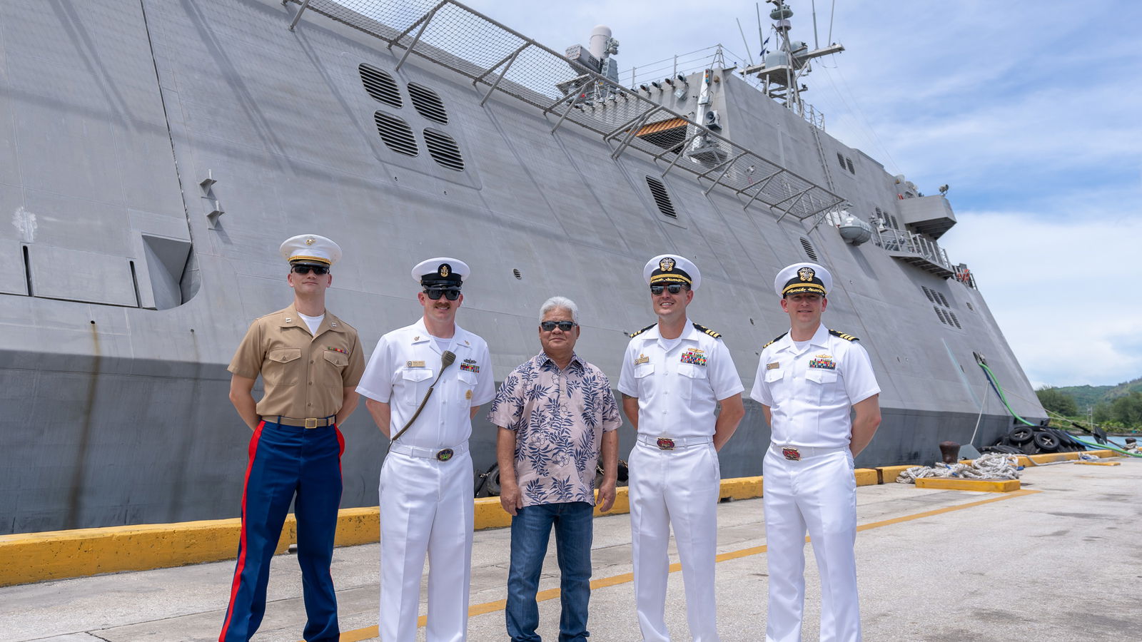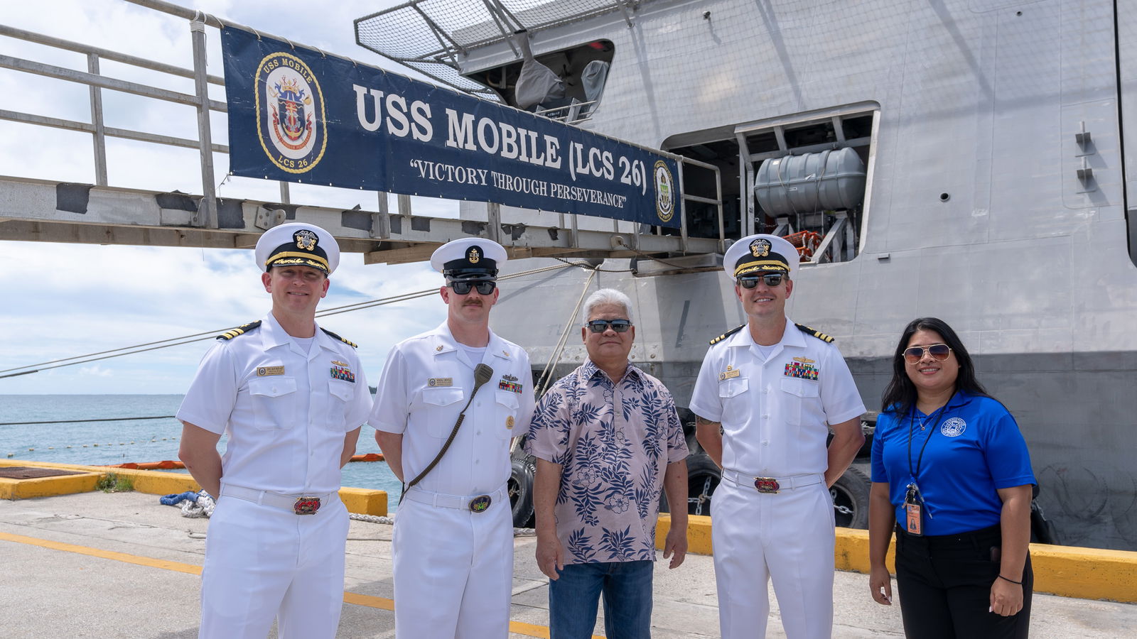 This past weekend, Gov, Arnold I. Palacios welcomed Commander David Gardener, Commander Eric Burtner-Abt, Command Senior Chief Kendall Lindvold, and the crew of the USS Mobile to Saipan. The ship is making a port call through Thursday. The USS Mobile, an Independence-variant littoral combat ship, adds to the increasing number of port calls to the CNMI and underscores the islands’ role in regional security and its partnership with the United States Department of Defense.