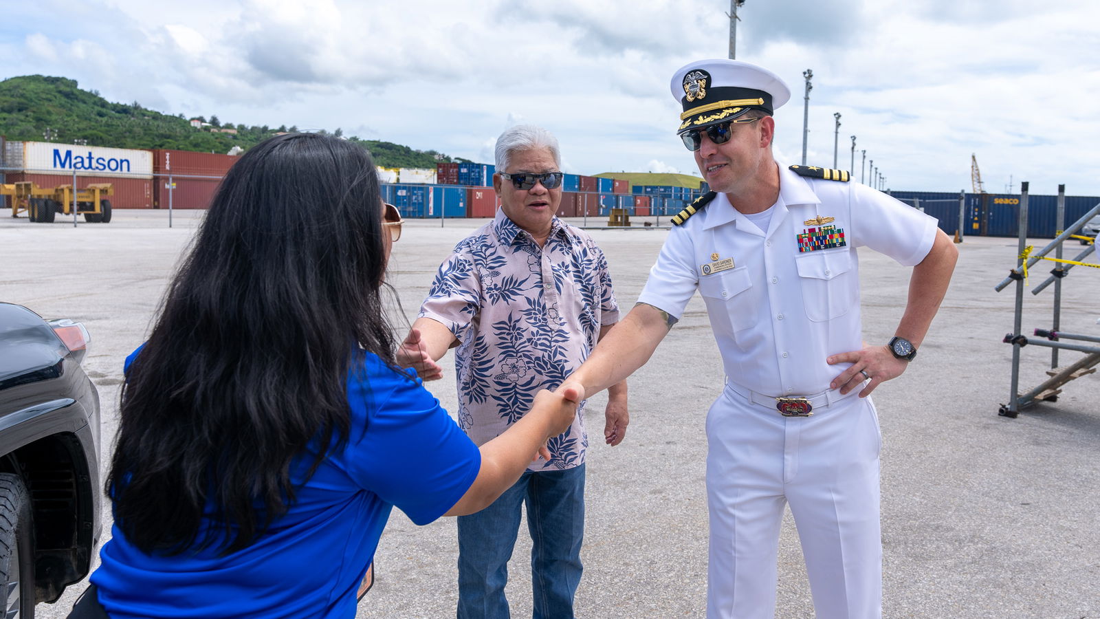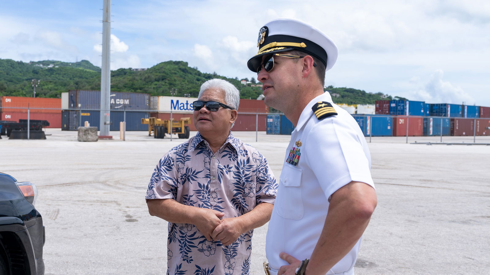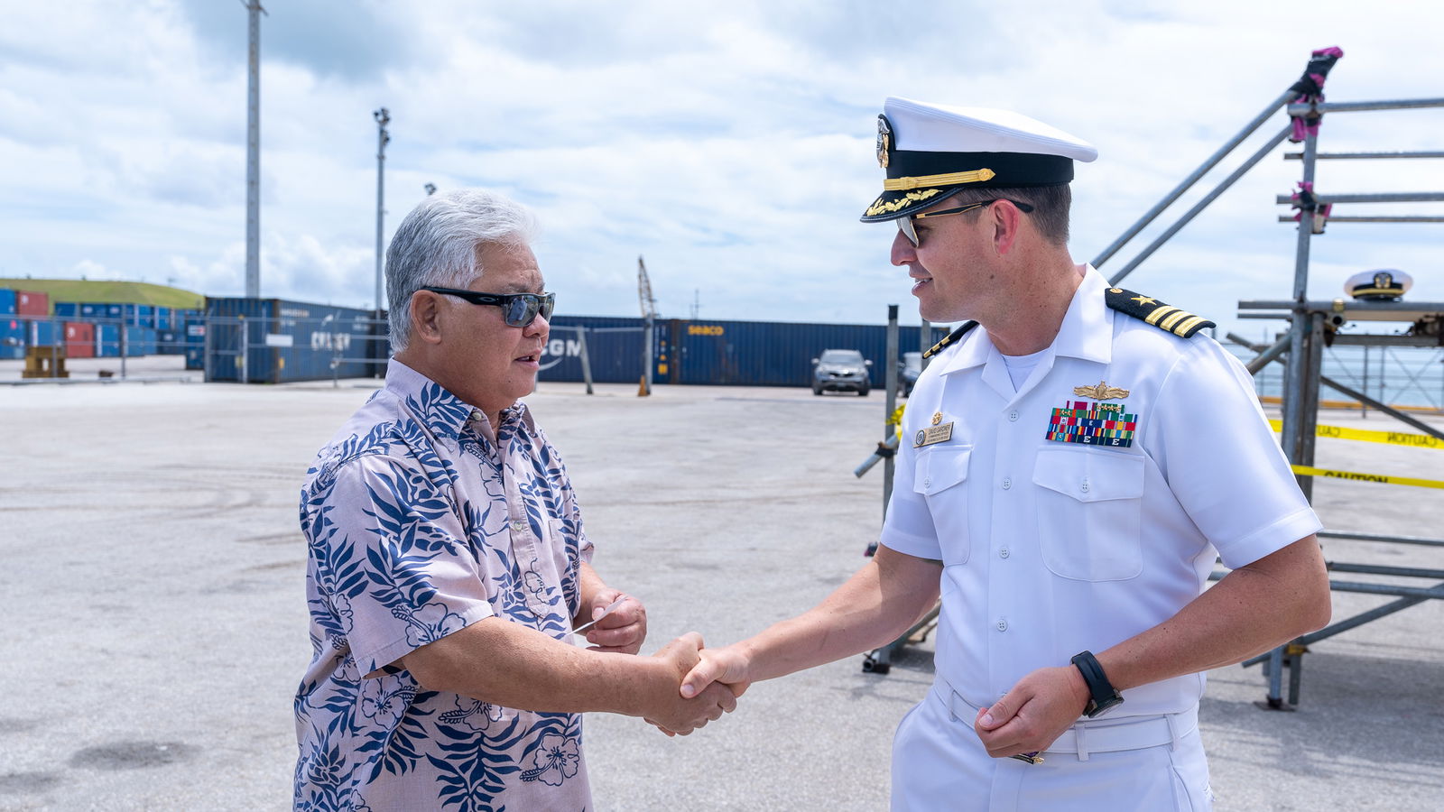 This past weekend, Gov, Arnold I. Palacios welcomed Commander David Gardener, Commander Eric Burtner-Abt, Command Senior Chief Kendall Lindvold, and the crew of the USS Mobile to Saipan. The ship is making a port call through Thursday. The USS Mobile, an Independence-variant littoral combat ship, adds to the increasing number of port calls to the CNMI and underscores the islands’ role in regional security and its partnership with the United States Department of Defense.