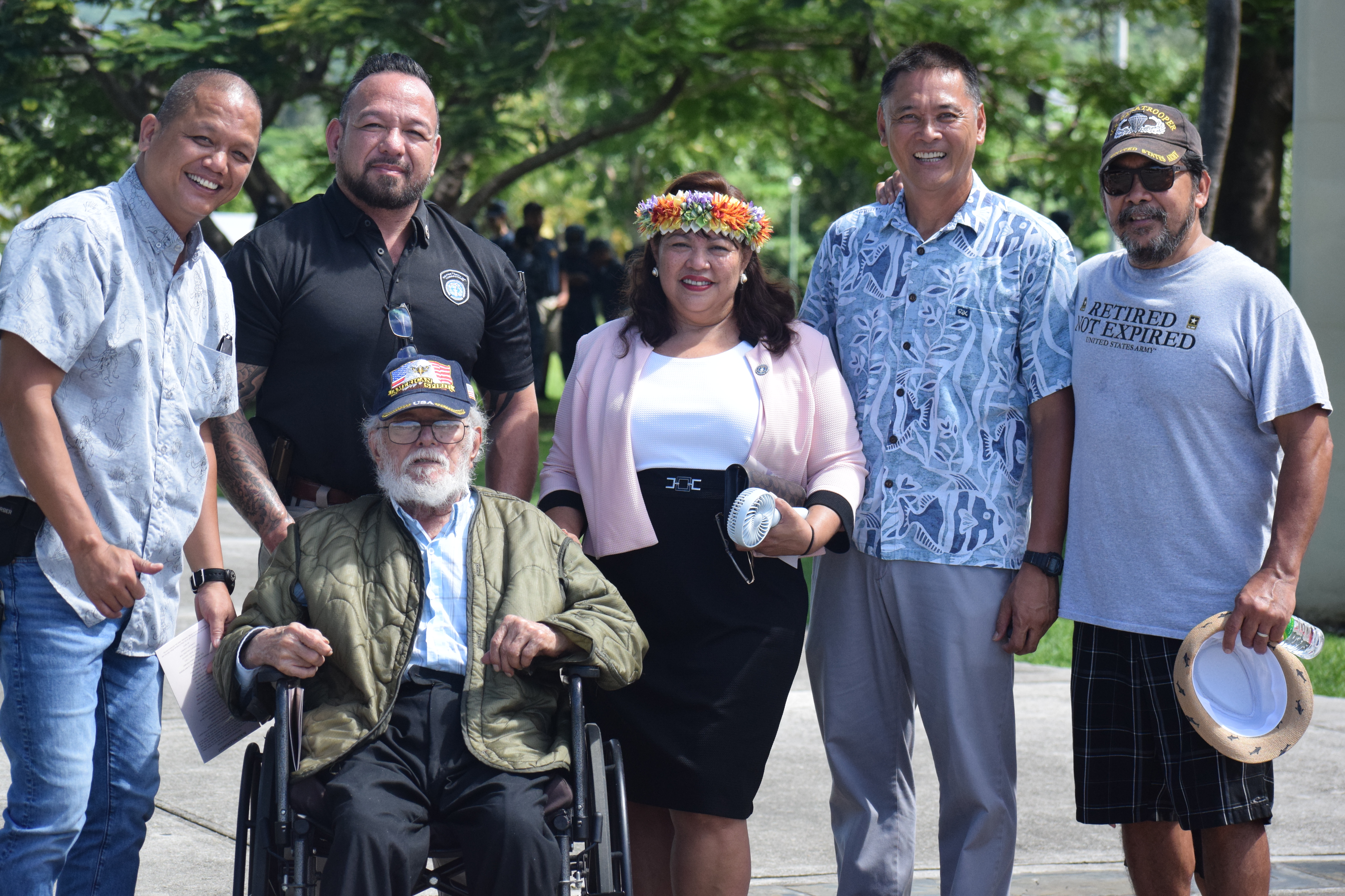 World War II survivor and former Rep. Stanley T. Torres with his son, Department of Corrections Commissioner  Anthony C. Torres, Sen. Celina Babauta, her husband Special Assistant for Homeland Security and Emergency Management Franklin Babauta, Rep. Vincent S. Aldan and a community member at American Memorial Park during the Veterans Day ceremony on Monday, Nov. 11, 2024. Torres was three years old when the U.S. invaded Saipan in 1944. With his parents and other family members, he hid in a cave while the Battle of Saipan raged. After the U.S. secured control of the island, Torres, his family and other local residents were held at the civilian internment camp in Chalan Kanoa for at least two years.
